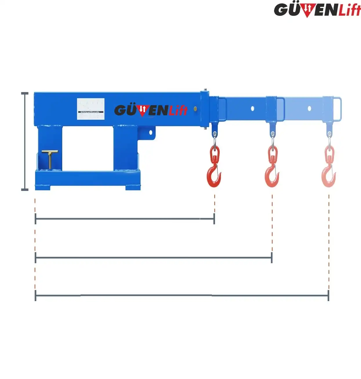 Ağır yükleri yukarıdan alıp taşımak istiyor ama vinciniz mi yok? Firmamızın teleskopik kancası ile forkliftinizi kısa sürede bir mobil vince dönüştürün ve menzilini artırın. Vinç kolu maksimum 2.500 kg çalışma yükü limitine, 185 x 65 mm çatal açıklıklarına ve 91 kg ağırlığa sahiptir.