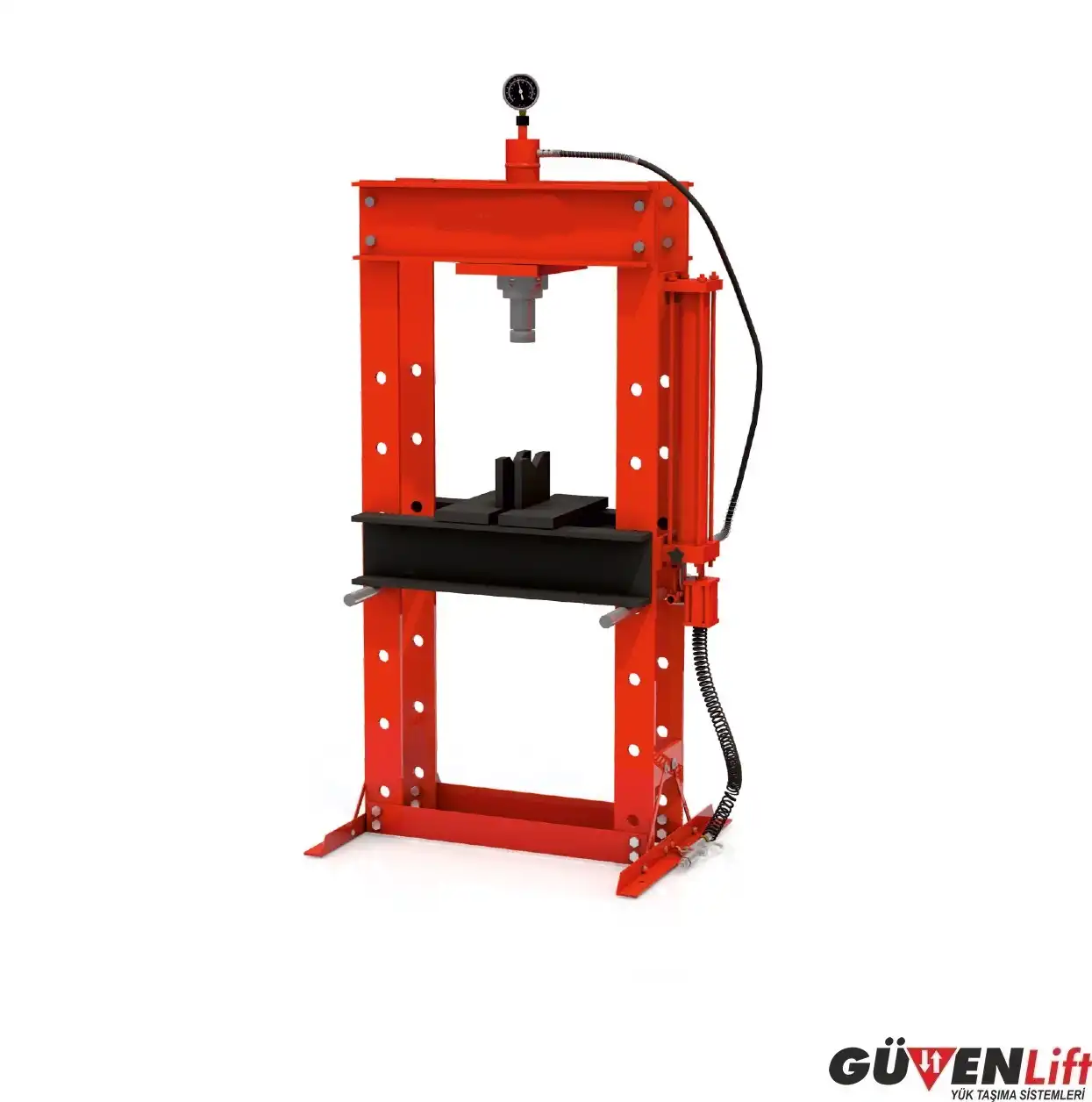 Güvenlift güvencesiyle sunulan 30 Ton Hidrolik Pres, ağır sanayi ve genel atölye uygulamalarında ihtiyaç duyulan yüksek baskı kuvvetini, hassas kontrol imkanıyla birleştirir. Rulman çakma, burç sökme, metal bükme ve doğrultma gibi yoğun güç gerektiren işlemler için ideal bir endüstriyel çözümdür.