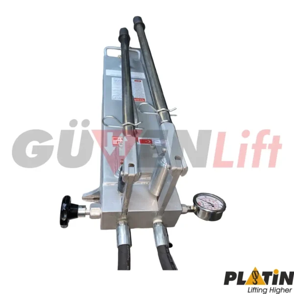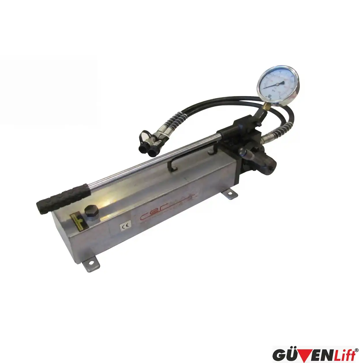 Güvenlift Çift Tesirli Hidrolik Pompa, çift etkili hidrolik silindirlerin profesyonel ve güvenli bir şekilde kontrol edilmesi için özel olarak geliştirilmiştir. Yüksek yağ haznesi ve çift hortum çıkış sistemiyle donatılan bu manuel hidrolik pompa, hem ileri hem de geri yönde hareket gerektiren operasyonlarda kesintisiz güç sağlar. 700 barlık yüksek çalışma basıncıyla en zorlu kaldırma, itme ve presleme işlerinde üstün performans sunar.