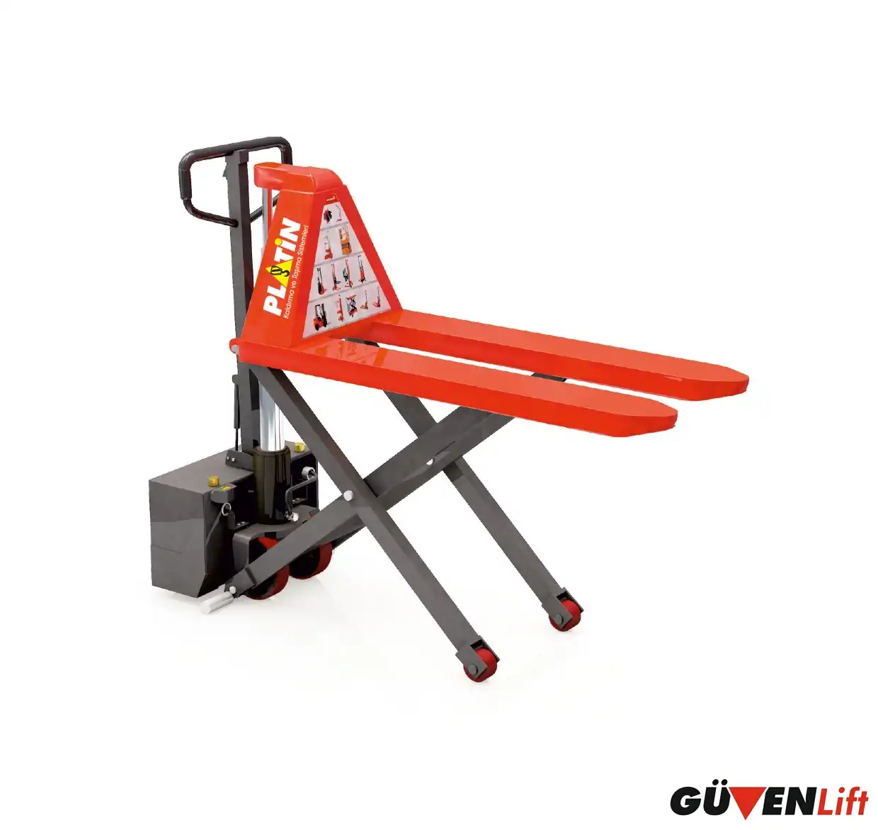 Güvenlift PGB1500, ağır yüklerinizi sadece taşımakla kalmaz, tek bir düğme dokunuşuyla zahmetsizce 80 cm yüksekliğe kaldırır. Manuel güç gerektirmeyen akülü kaldırma sistemi sayesinde personelin fiziksel yükünü azaltır, operasyon sürenizi kısaltır ve iş kazası riskini minimuma indirir. Hem bir transpalet hem de ayarlanabilir bir çalışma tezgahı olarak çok yönlü kullanım sunar.